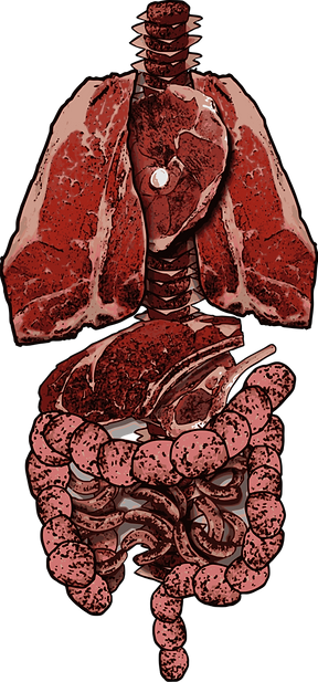 Show 'em what you're made of. "Anatomy of a Carnivore" captures the wonder and mystery of our innermost workings in steak, lamb chops, sausage, and meatballs, on a spine of stacked hamburger patties.